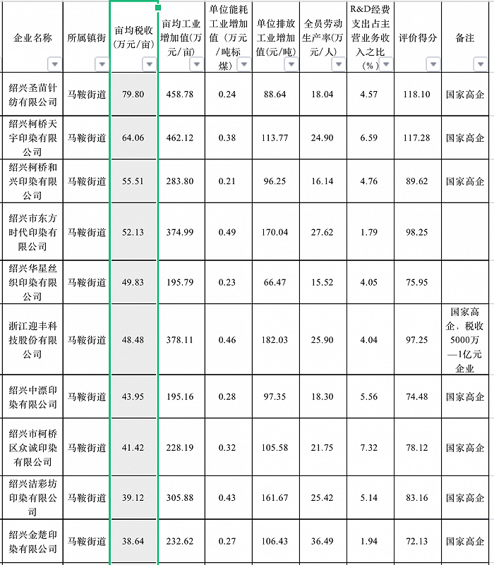 2019年柯橋區(qū)工業(yè)企業(yè)畝均效益評定結(jié)果。信息來源:柯橋區(qū)人民政府