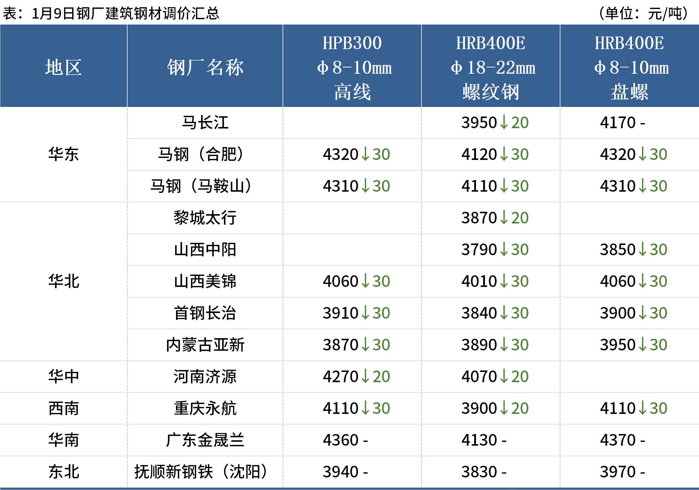 1月9日,全國累計11家鋼廠發(fā)布調(diào)價信息,其中9家鋼廠降價,整體調(diào)幅在0-30元/噸。
