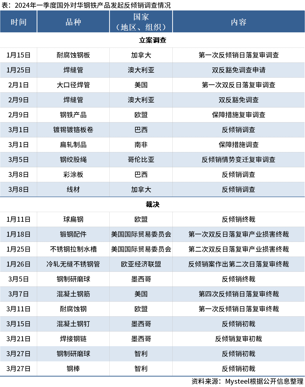 據(jù)Mysteel不完全統(tǒng)計,2024年一季度中國貿(mào)易救濟(jì)信息網(wǎng)陸續(xù)公布了21起國外對中國鋼鐵產(chǎn)品發(fā)起的反傾銷、反補(bǔ)貼調(diào)查或裁決。涉案品種包括耐腐蝕鋼板、焊縫管、大口徑焊管、鋼鐵產(chǎn)品、球扁鋼、鍛鋼配件、不銹鋼拉制水槽、鋼制研磨球、混凝土鋼筋、鋼棒等。具體如下: